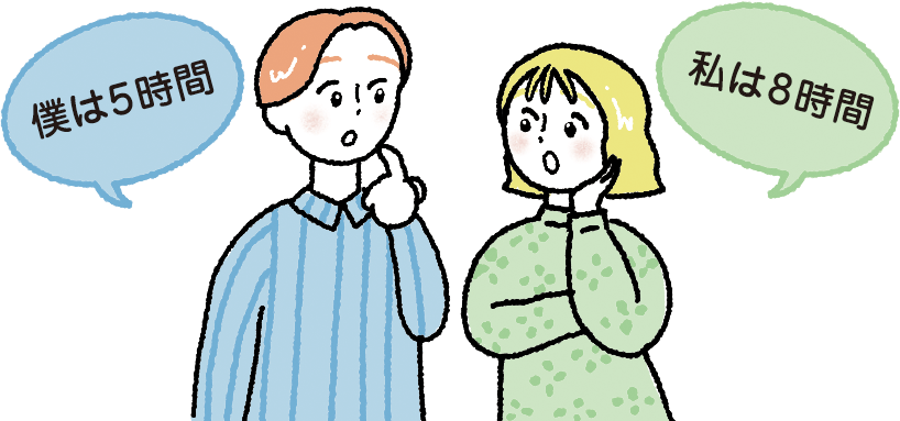 睡眠には個人差があり、生活習慣や持病などによっても変化します。また、各年代の睡眠時間の目安より長い睡眠を必要とする人や、短い睡眠でも十分な人もいます。