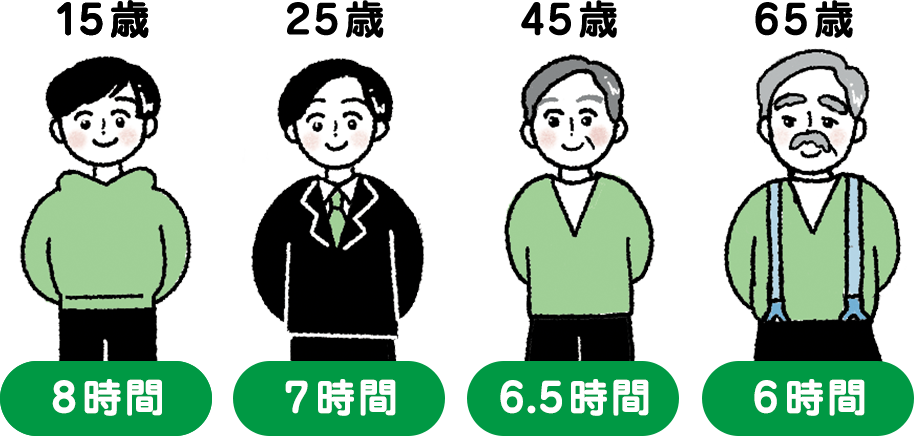 眠れる時間は、成年後は20年ごとに30分程度の割合で短くなります。例えば15歳前後では約8時間ですが、25歳で約7時間、45歳では約6.5時間になります。